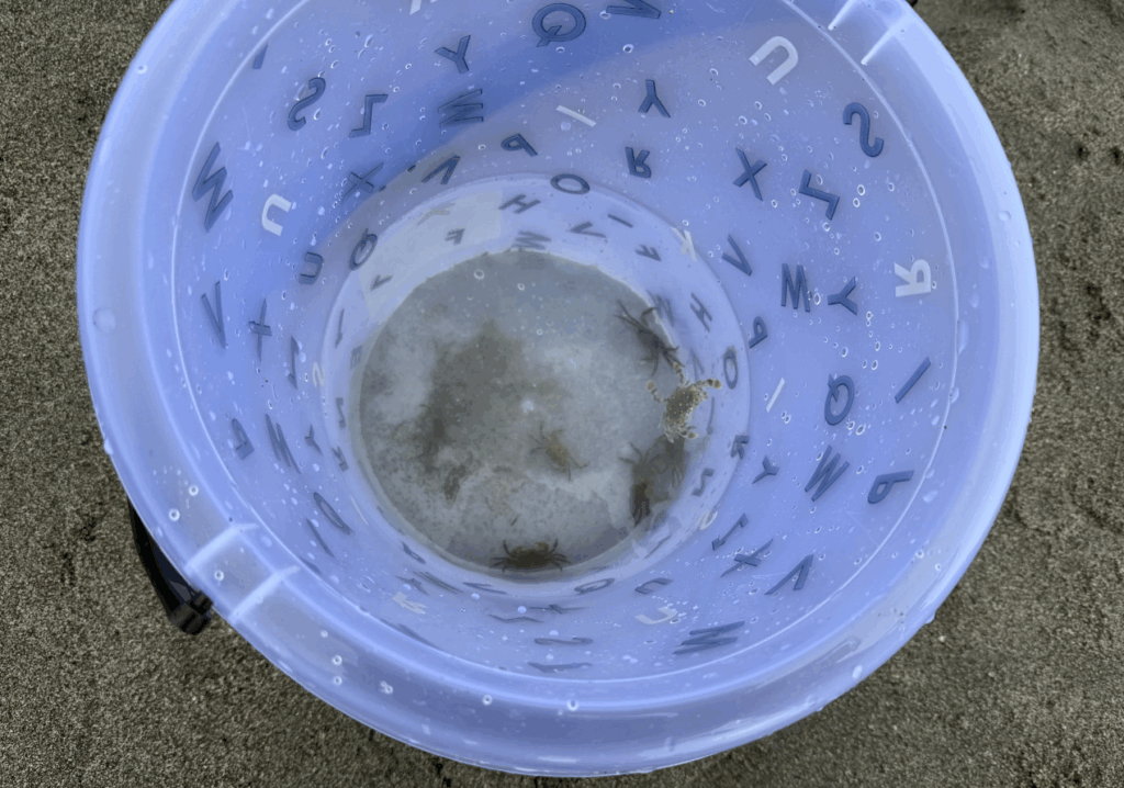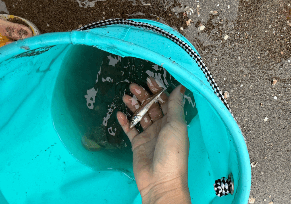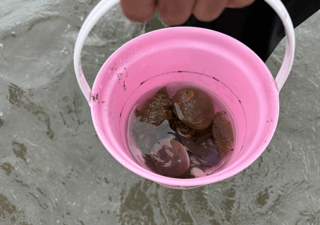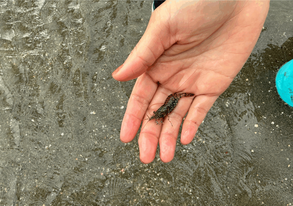 みんなが捕まえたのはカニ、魚、貝、エビ、ヤドカリなど。アサリの天敵ツメタガイを捕まえた子もいました!